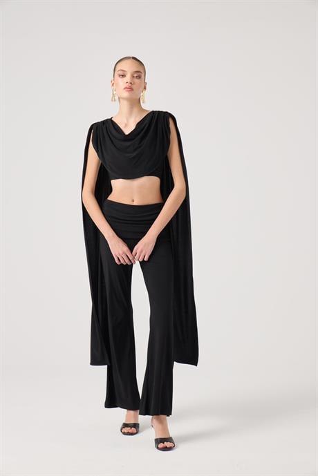 Yakası Şal Detaylı Fermuar Kapamalı Crop Bluz ve Beli Kıvırmalı ve Büzgülü İspanyol Paça Pantolon İkili Takım.